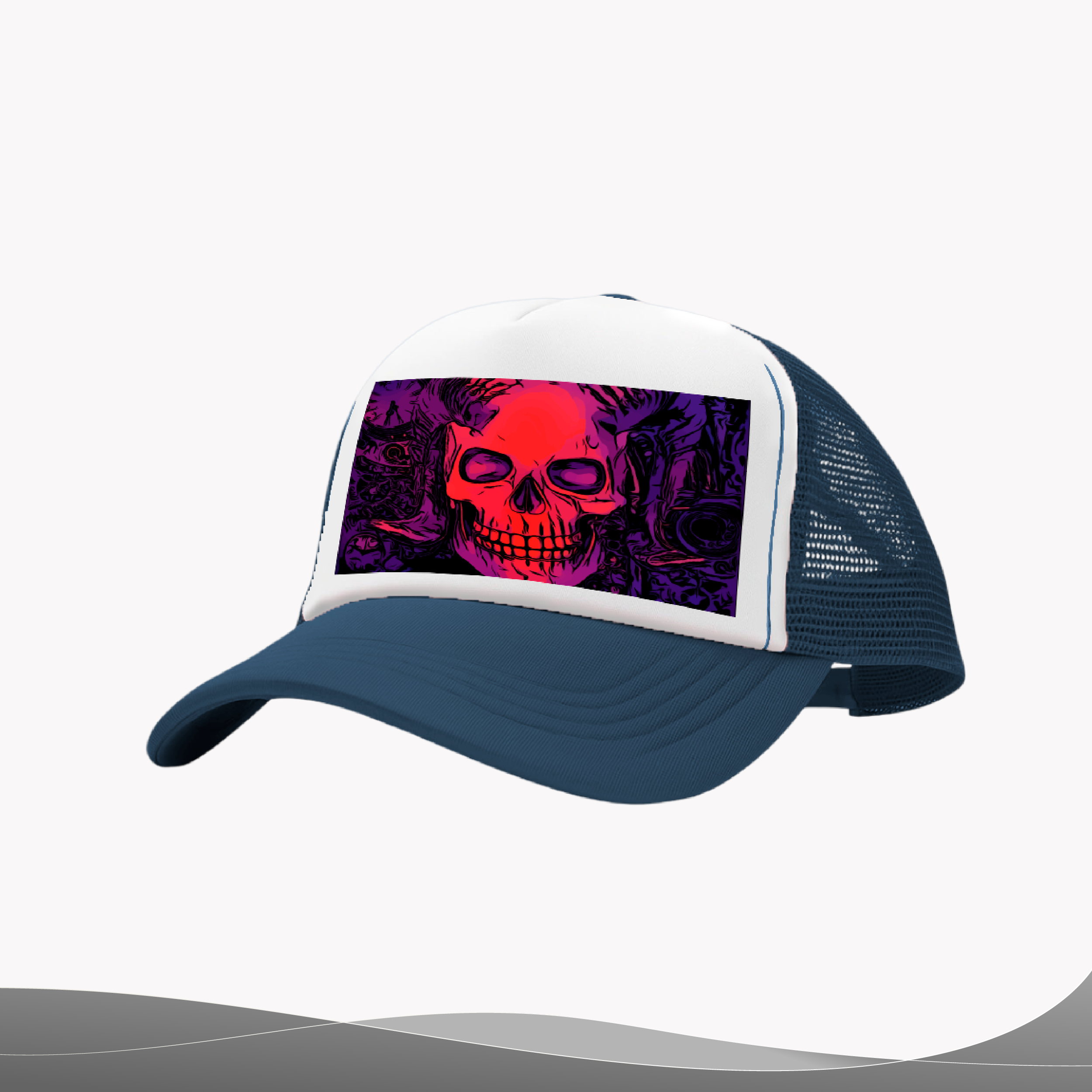 Gorra tipo camionero estampada, con ilustración de calavera en tonos naranjas y púrpuras, un diseño intenso que mezcla contraste, actitud y un estilo visual fuerte.