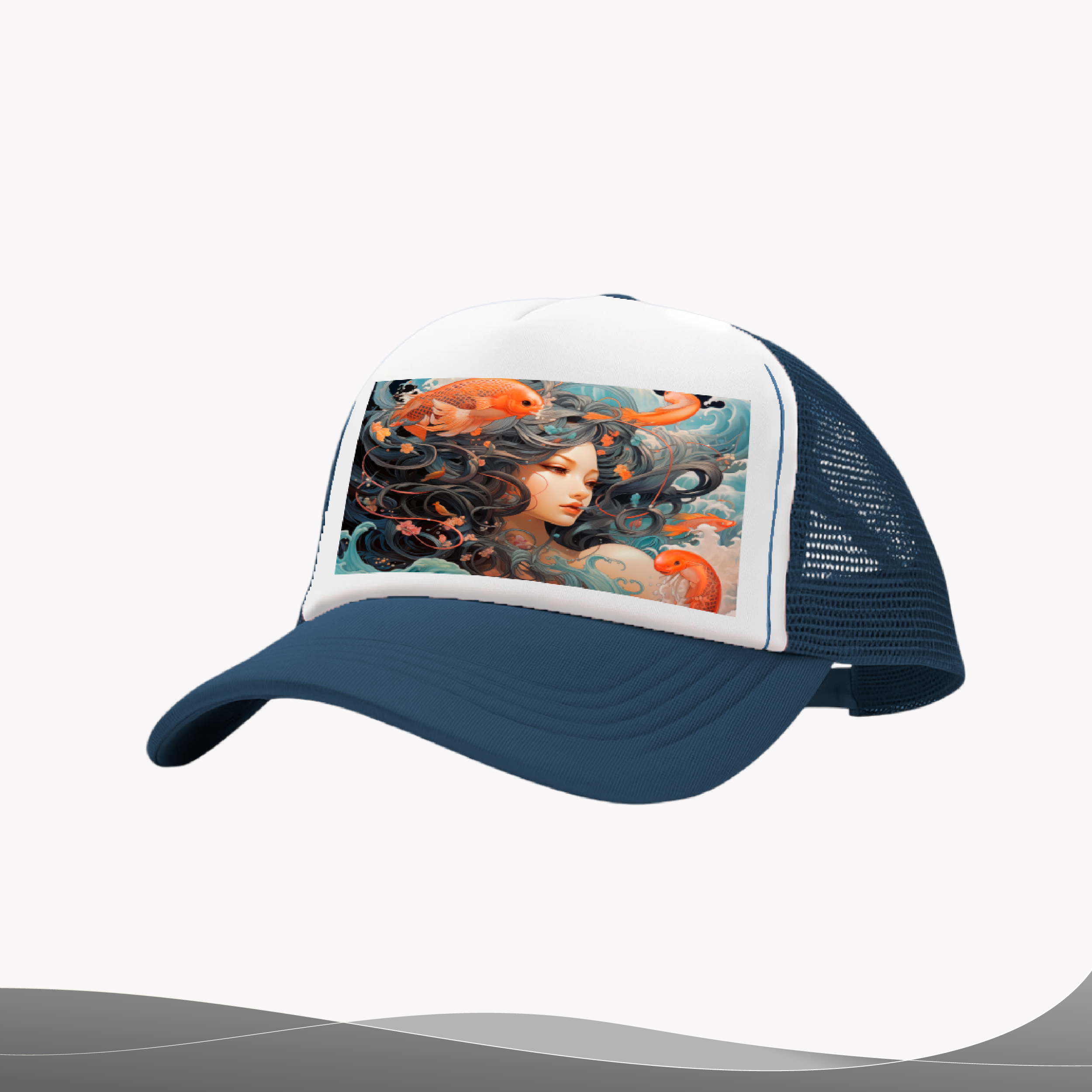 Gorra tipo camionero estampada, con ilustración de chica oriental rodeada de peces, un diseño artístico que evoca armonía y simbolismo del estilo oriental.