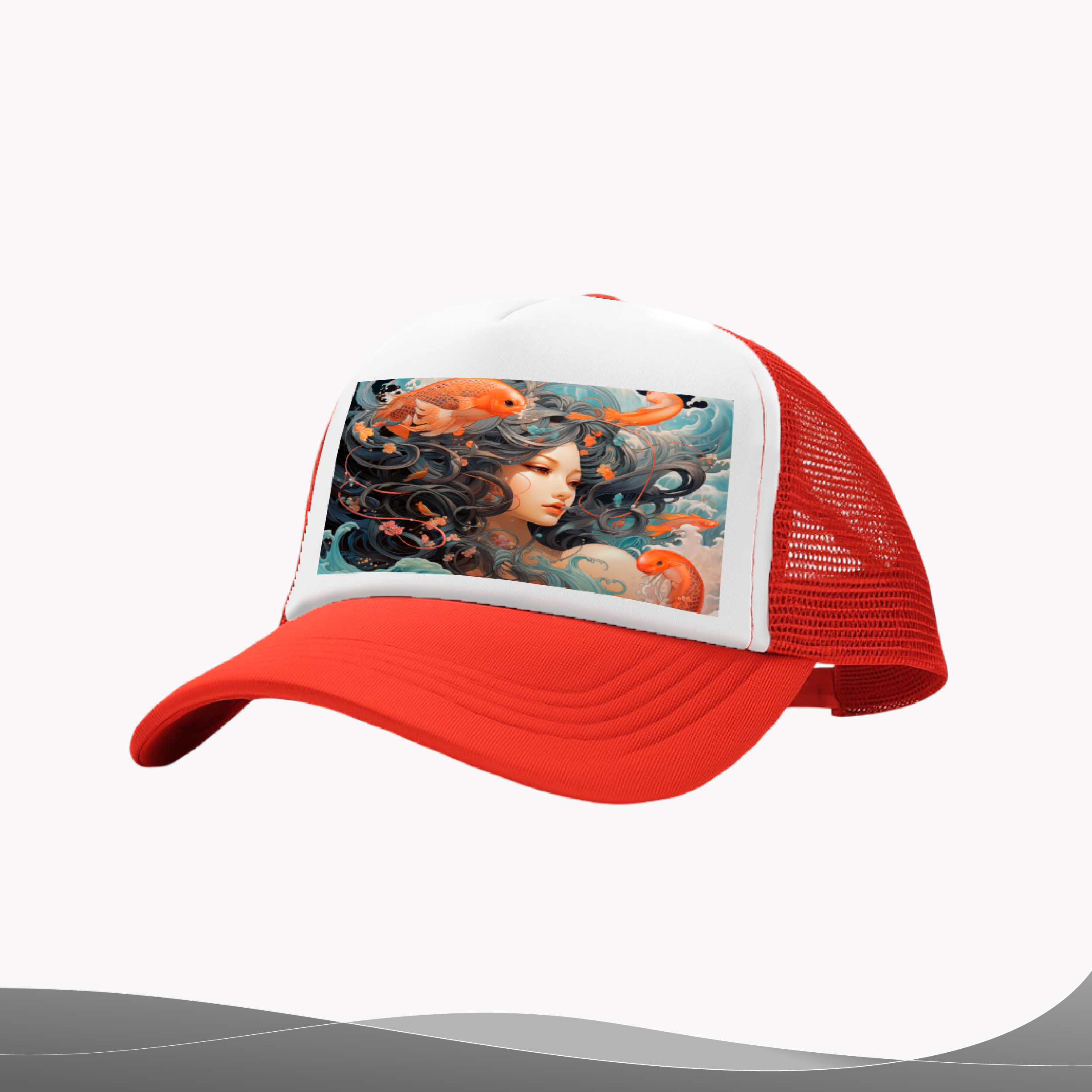 Gorra tipo camionero estampada, con ilustración de chica oriental rodeada de peces, un diseño artístico que evoca armonía y simbolismo del estilo oriental. Ideal para quienes buscan algo visualmente expresivo. ¿Te identifica este tipo de arte?