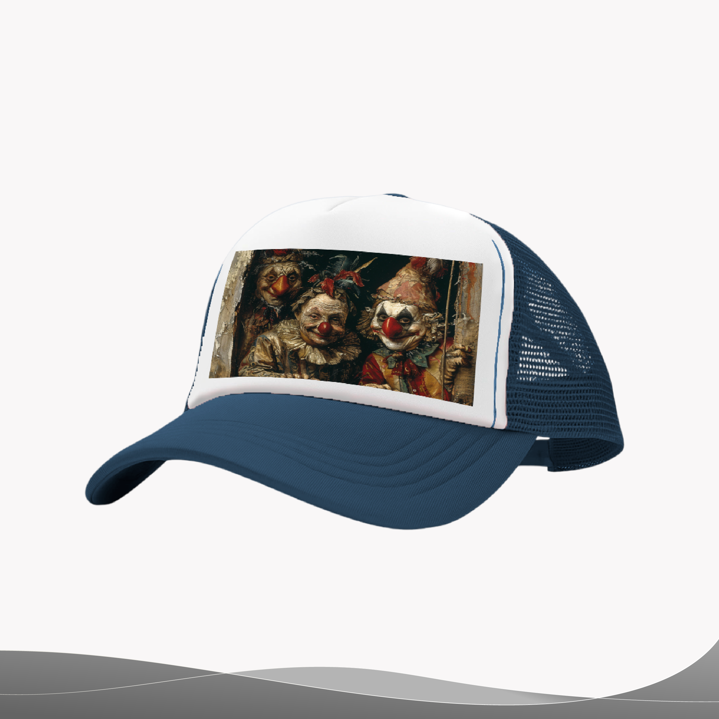 Gorra tipo camionero estampada, con pintura artística de payasos tristes, un diseño expresivo que transmite emoción y profundidad desde el arte visual. Pensada para quienes buscan algo fuera de lo convencional. ¿Te atraen los diseños con carga emocional?
