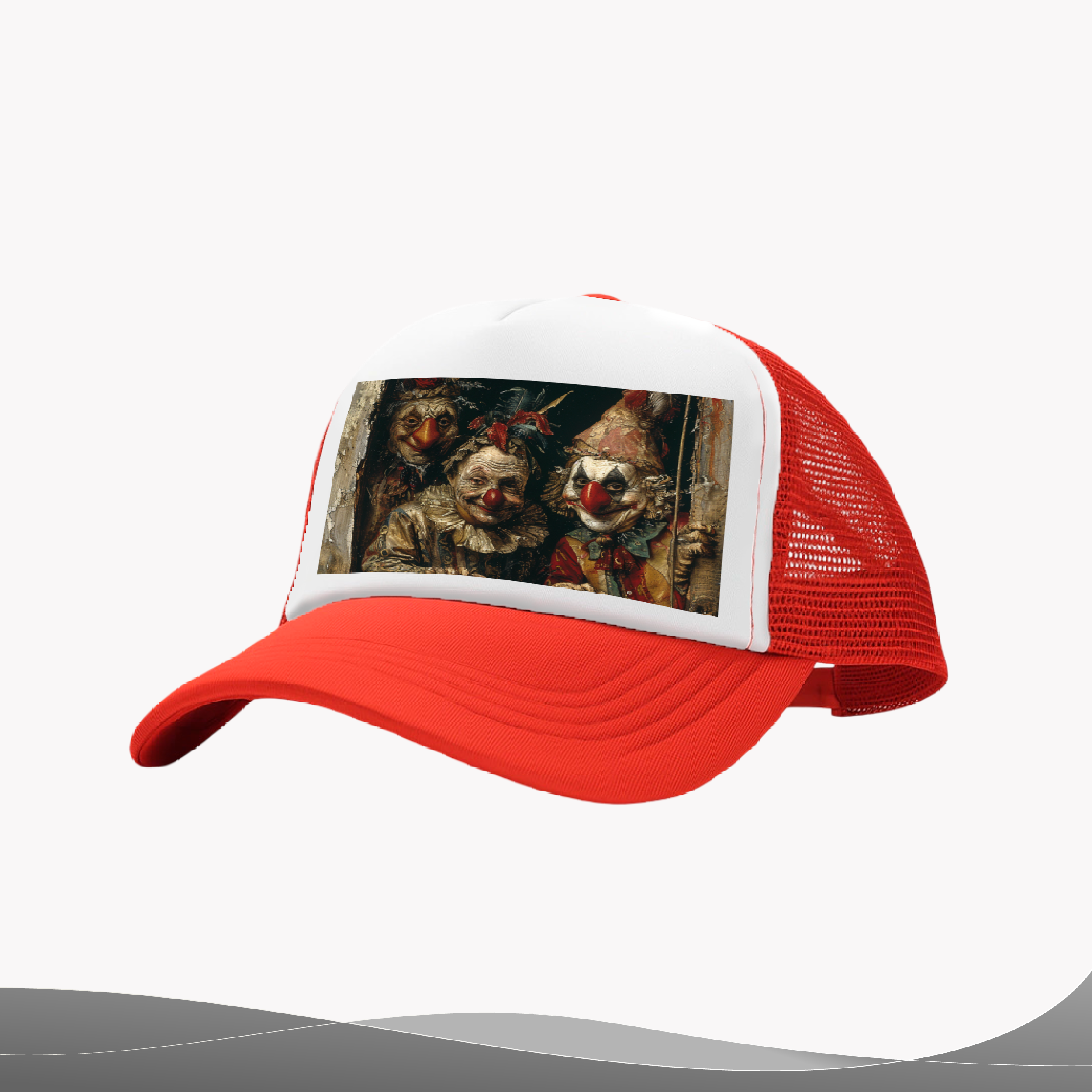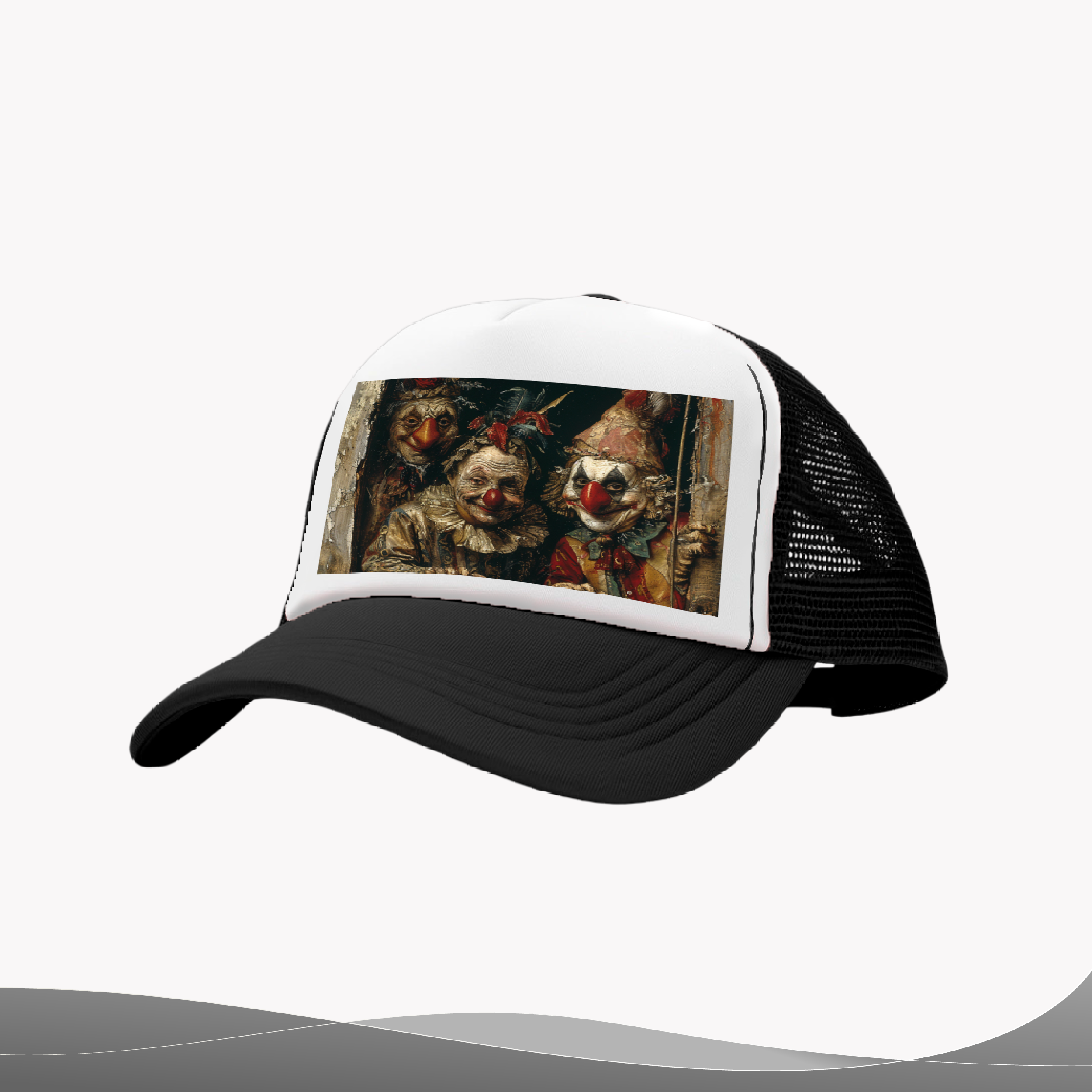 Gorra tipo camionero estampada, con pintura artística de payasos tristes, un diseño expresivo que transmite emoción y profundidad desde el arte visual.