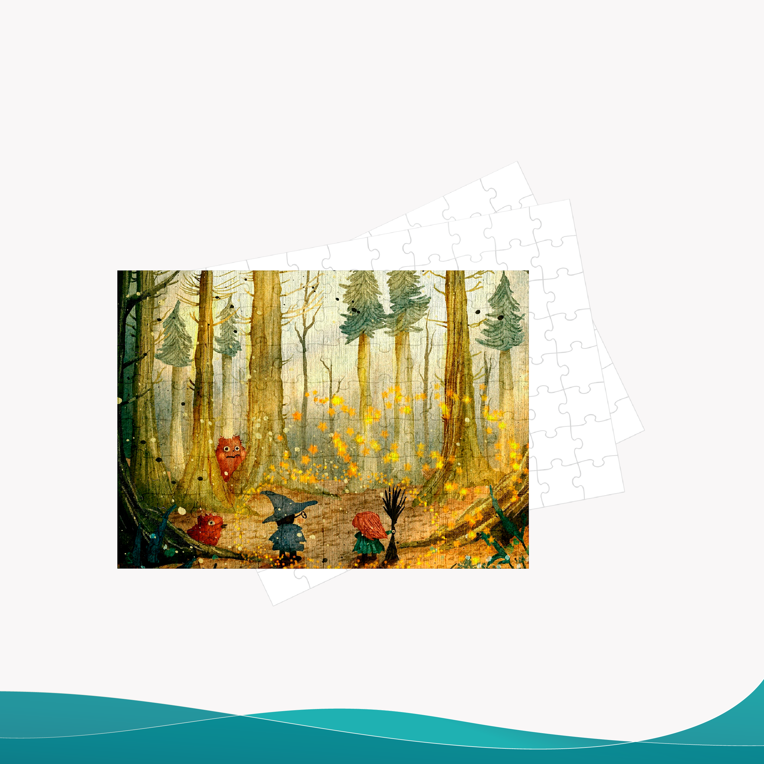 Rompecabezas estampado tamaño A5, con ilustración tipo cartoon de brujitas en un bosque, una escena divertida y encantadora que mezcla fantasía y naturaleza. Ideal para quienes disfrutan diseños con historia. ¿Te gustaría armar esta escena mágica pieza por pieza?