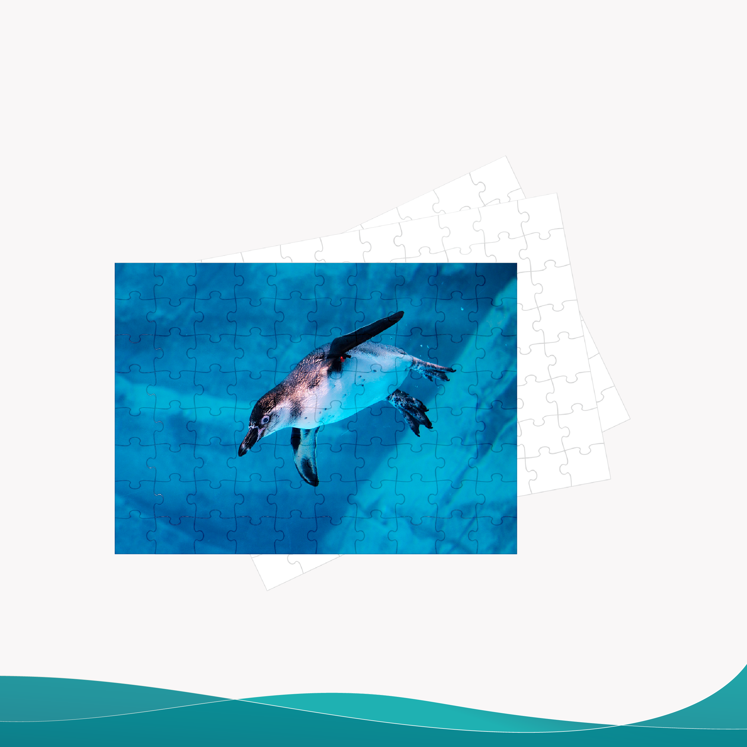 Rompecabezas estampado tamaño A5, con fotografía de pingüino nadando, una escena dinámica que muestra la vida de los animales y las aves en su entorno acuático. Ideal para amantes del mundo natural. ¿Te animas a armar esta escena submarina?