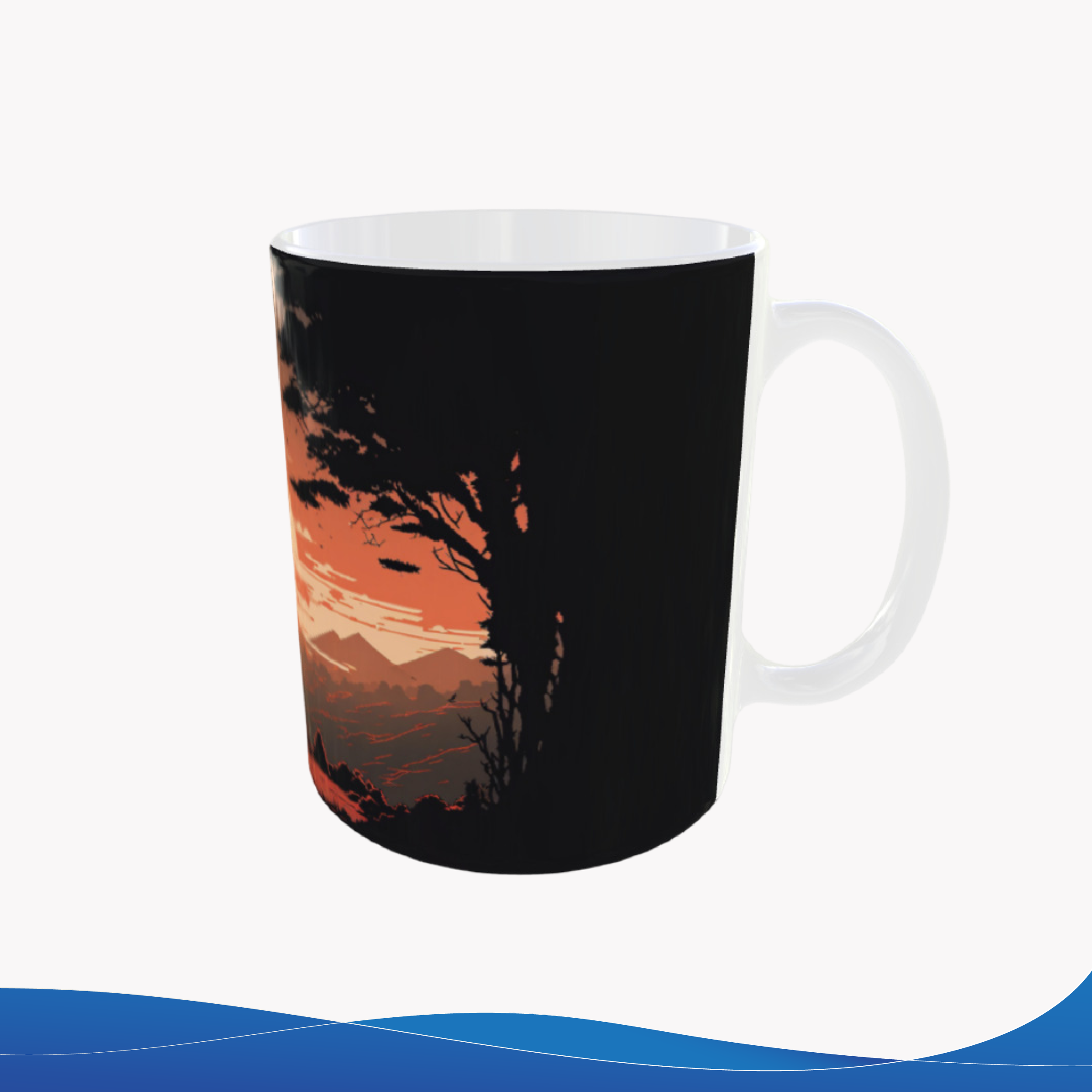 Taza de cerámica 11oz, con arte ilustrado tipo anime, una escena atmosférica que conecta anime y estilo oriental. Resistente y funcional. ¿Te identificas con este estilo visual?