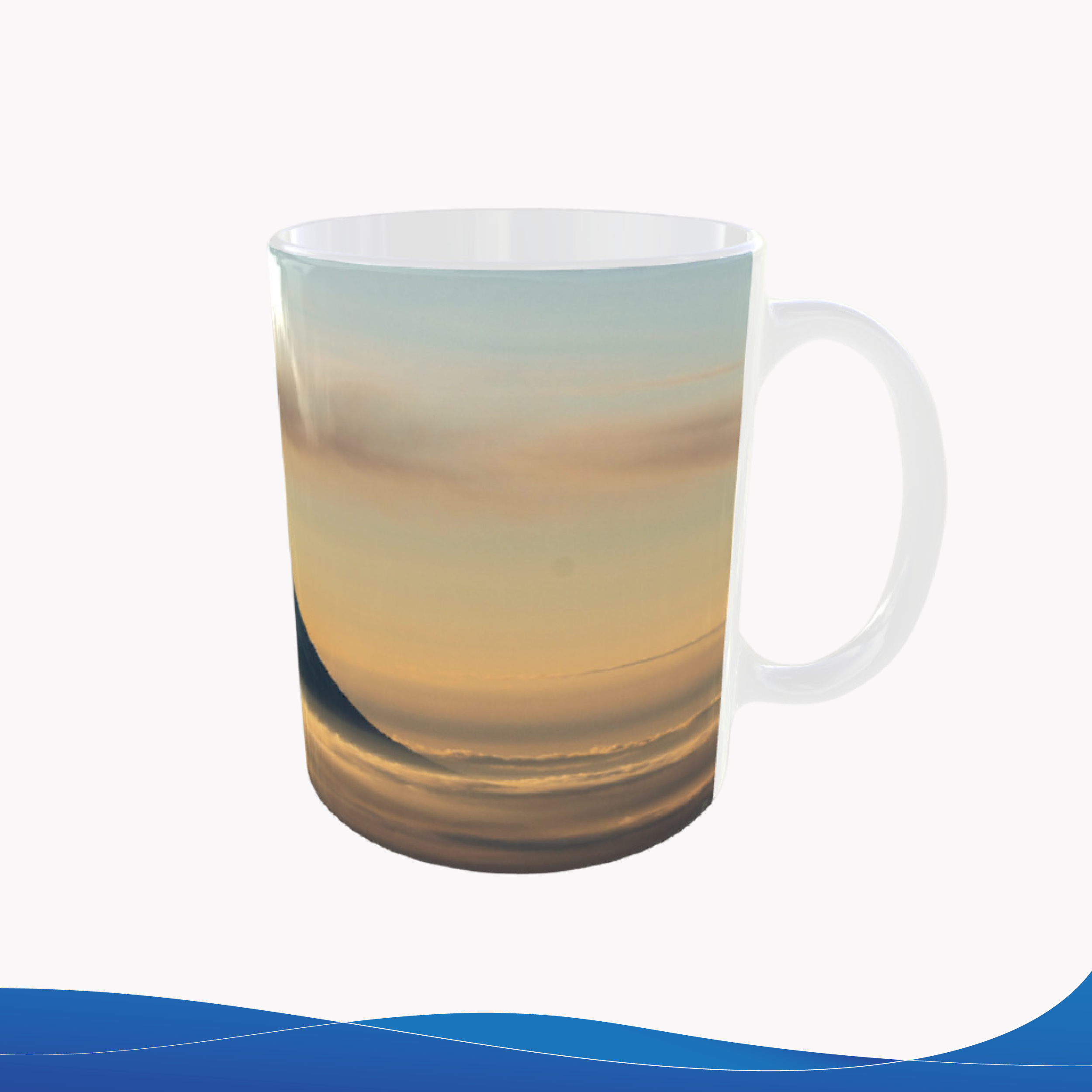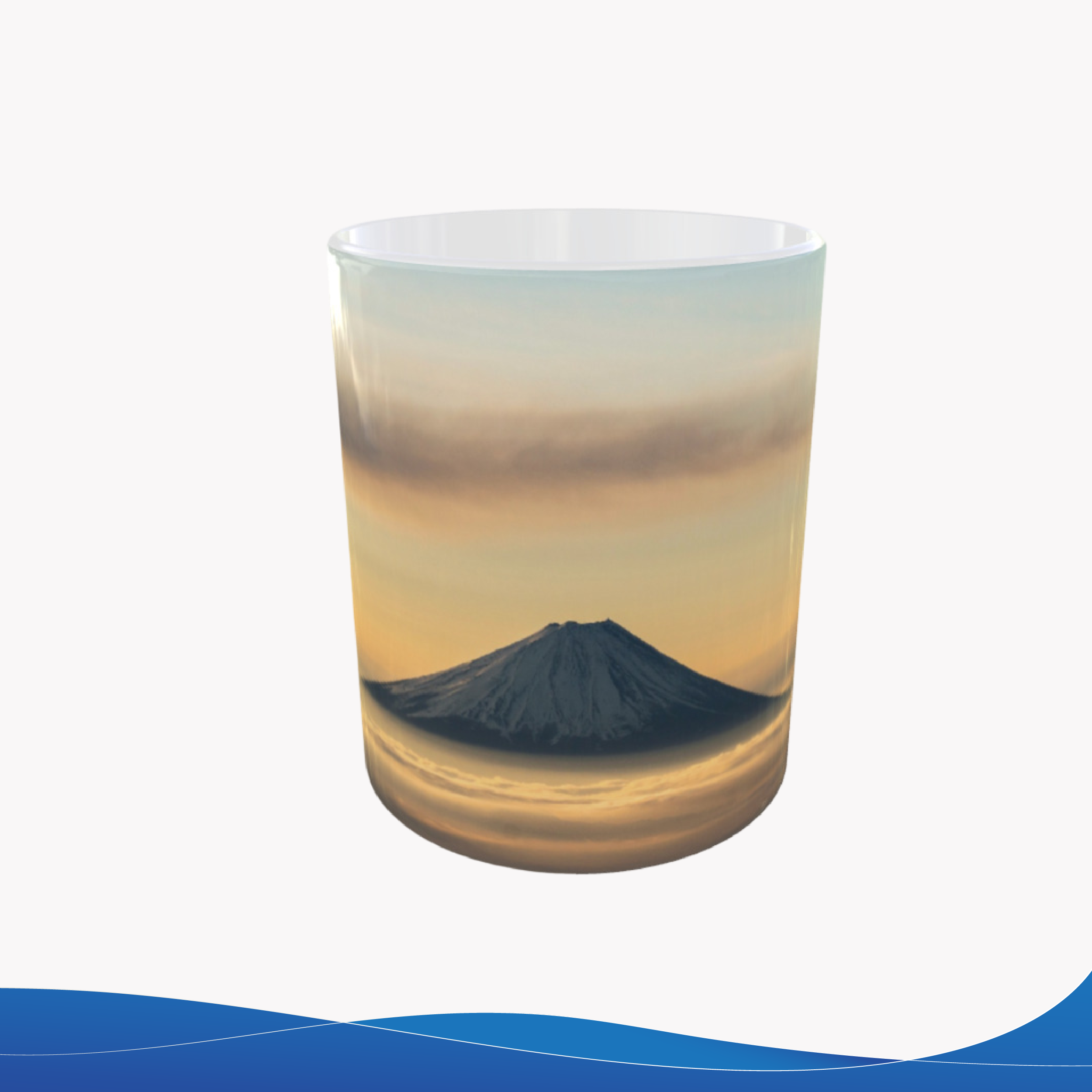 Taza de cerámica 11oz, con fotografía del Monte Fuji al atardecer, un paisaje inspirado en la naturaleza y el estilo oriental. Duradera y funcional. ¿Te imaginas este paisaje en tu rutina diaria?