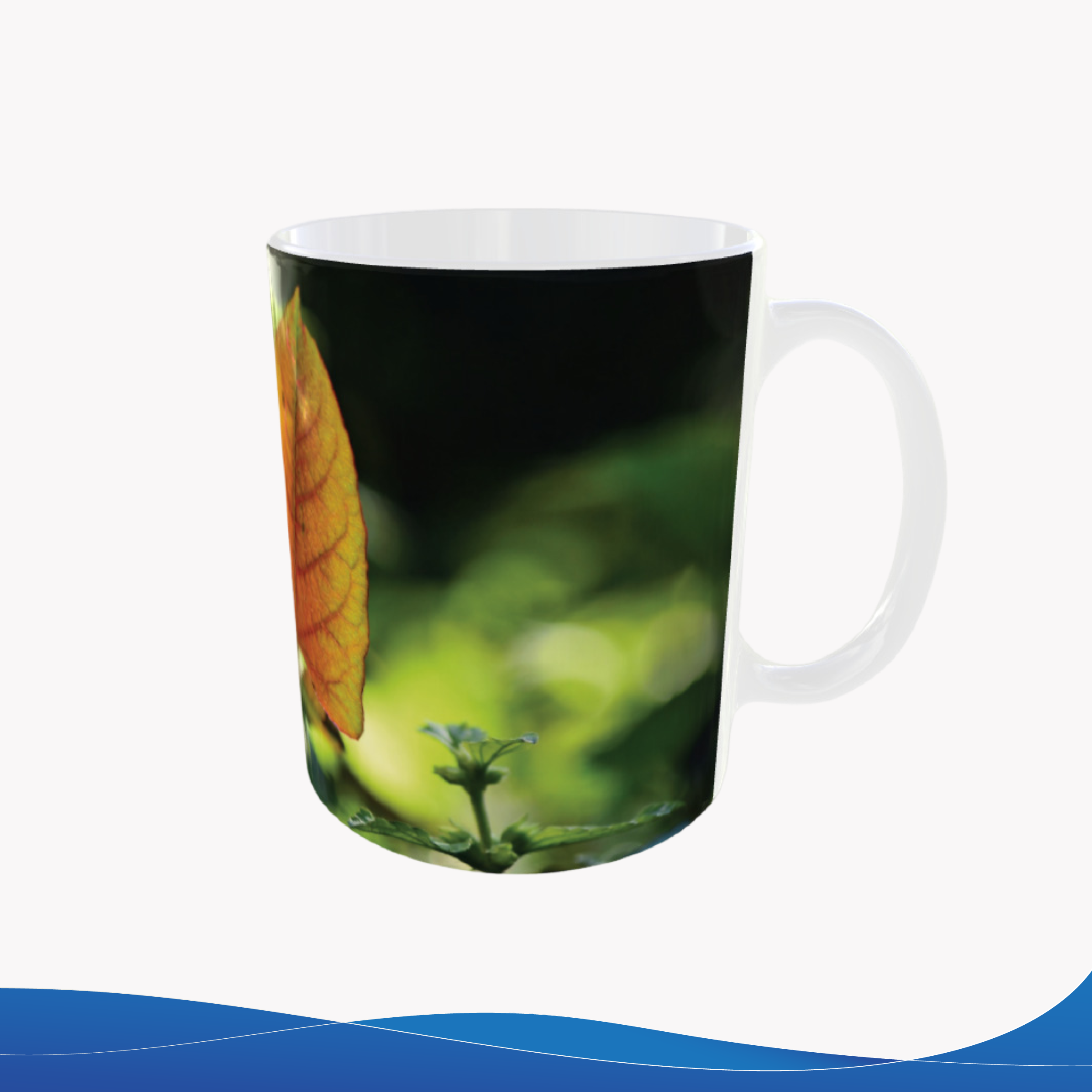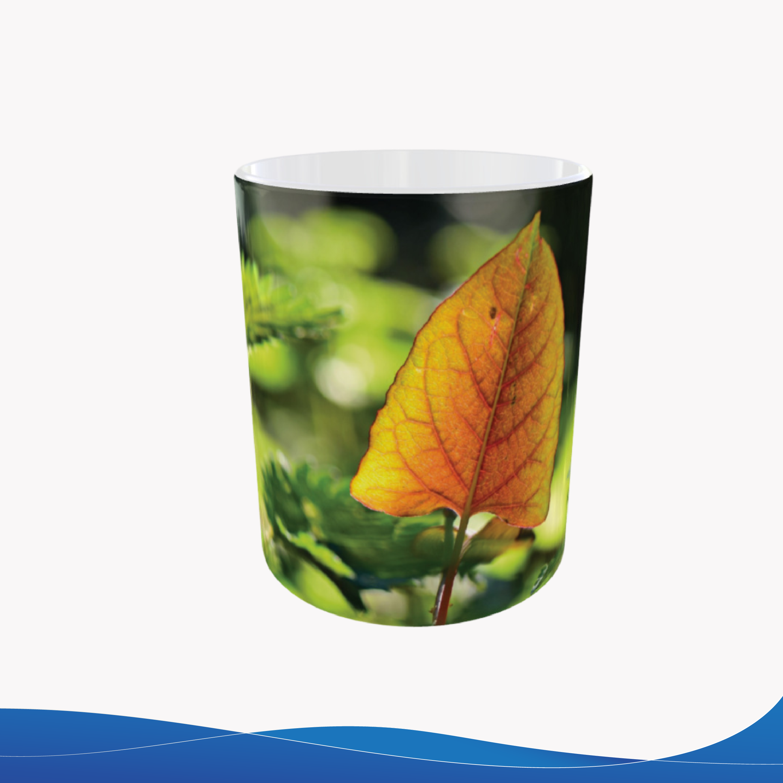 Taza de cerámica 11oz, con fotografía de hojas en bosque verde, un diseño fresco inspirado en la naturaleza. Pensada para uso diario. ¿Te gustaría una taza que transmita calma?