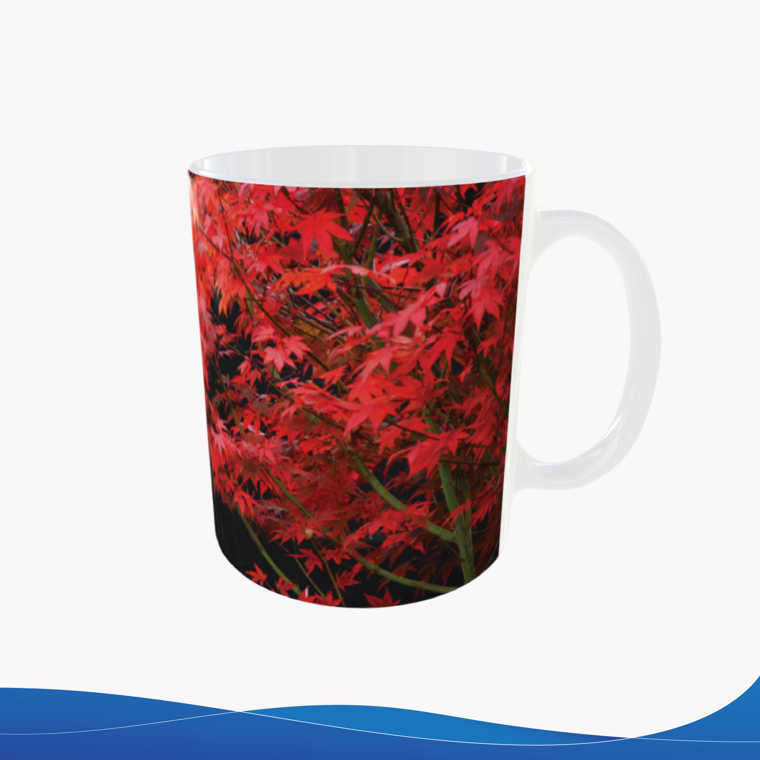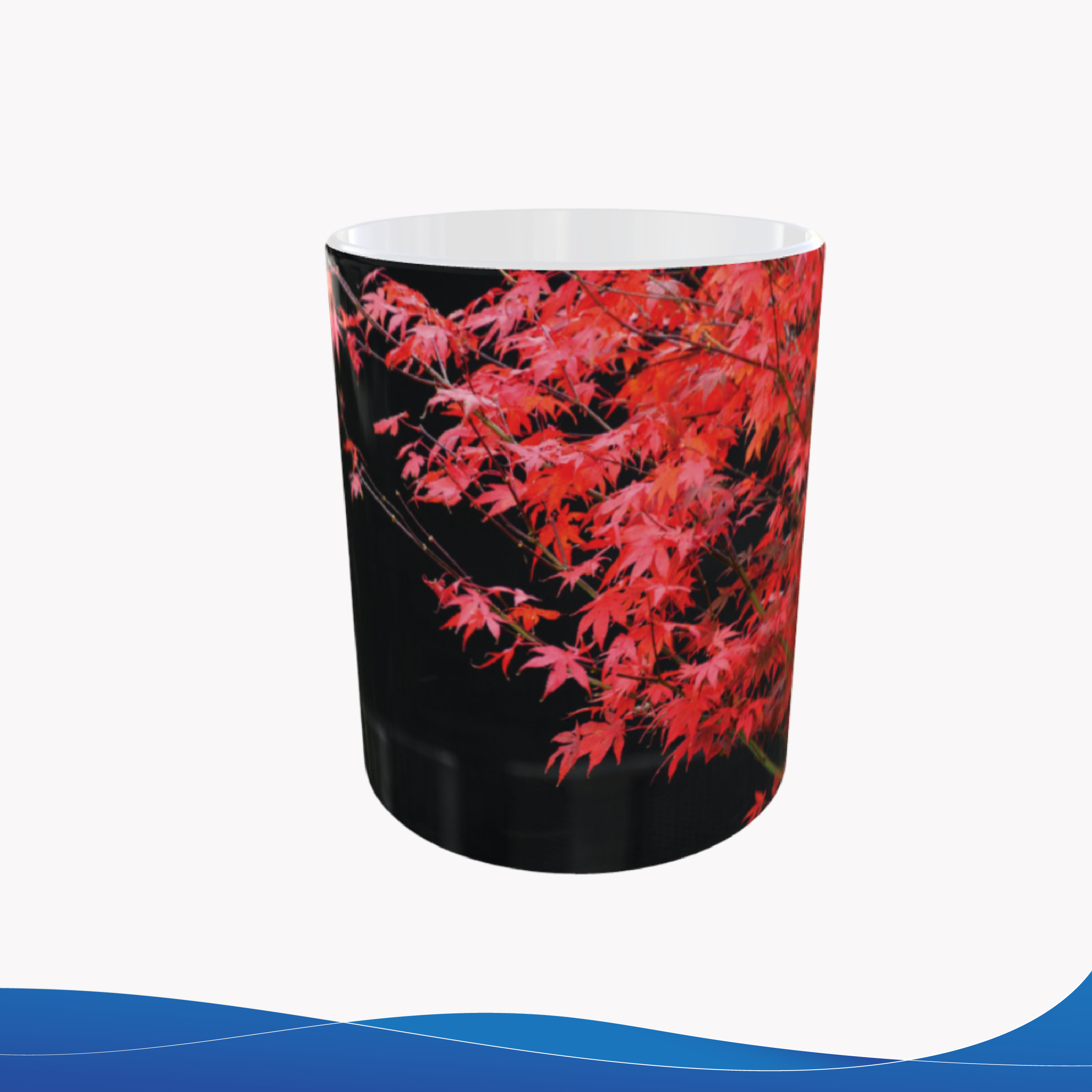 Taza de cerámica 11oz, con fotografía de arce japonés sobre fondo oscuro, un diseño elegante inspirado en la naturaleza. Duradera y práctica. ¿Te atraen los contrastes intensos?