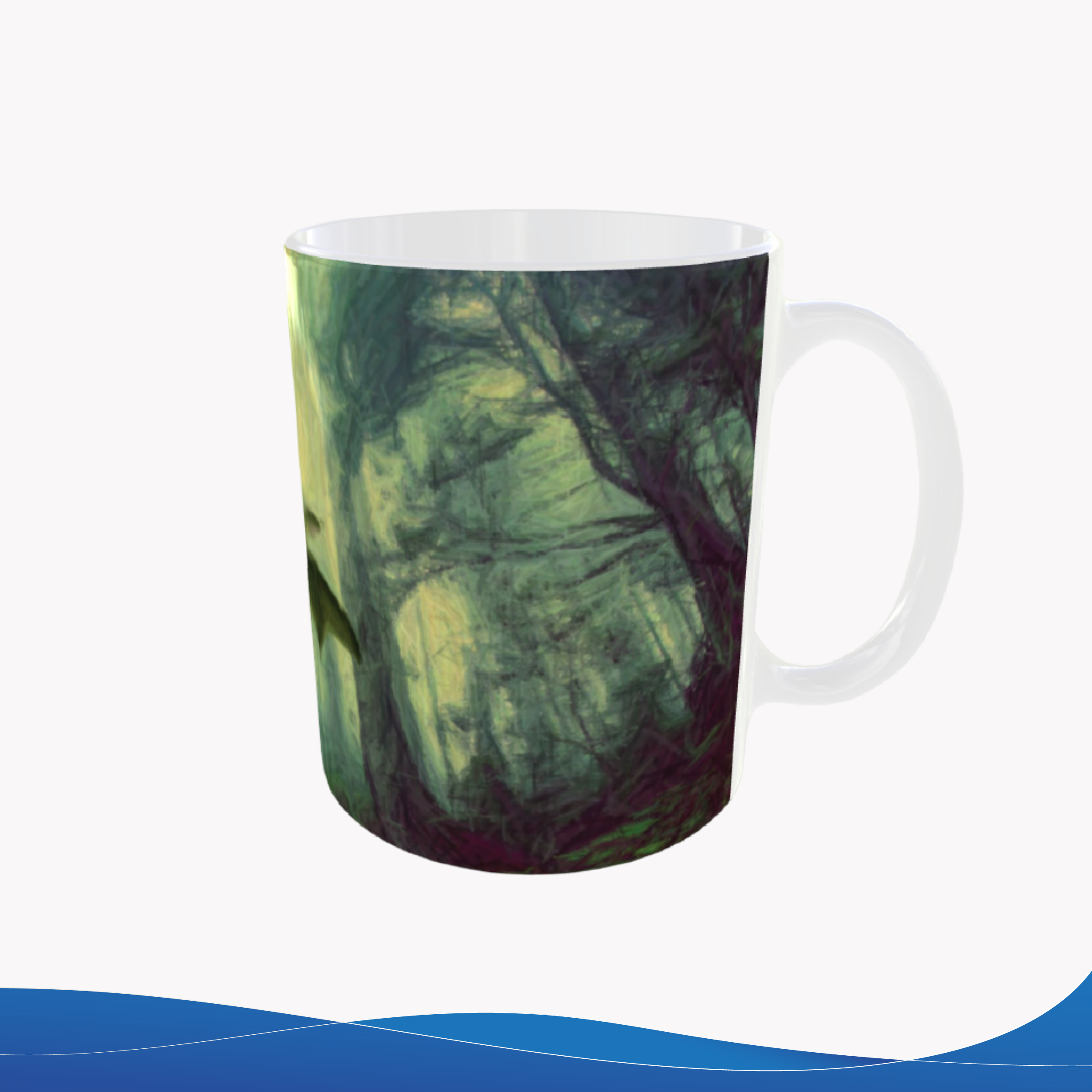 Taza de cerámica 11oz, con dragón ilustrado en paisaje natural, una composición visual fuerte ligada a los dragones y el mundo animal. Ideal para destacar tu estilo. Personalízala a tu manera.