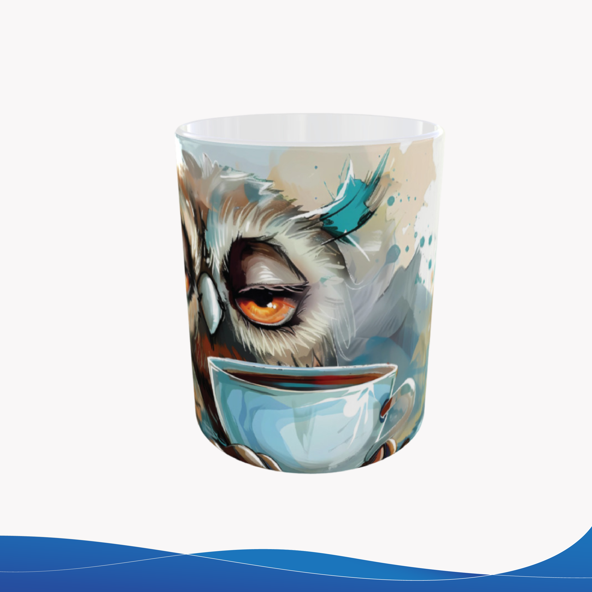 Taza de cerámica 11oz, con pintura ilustrada de búho tomando café, un diseño creativo que mezcla arte y el encanto de las aves del mundo animal.