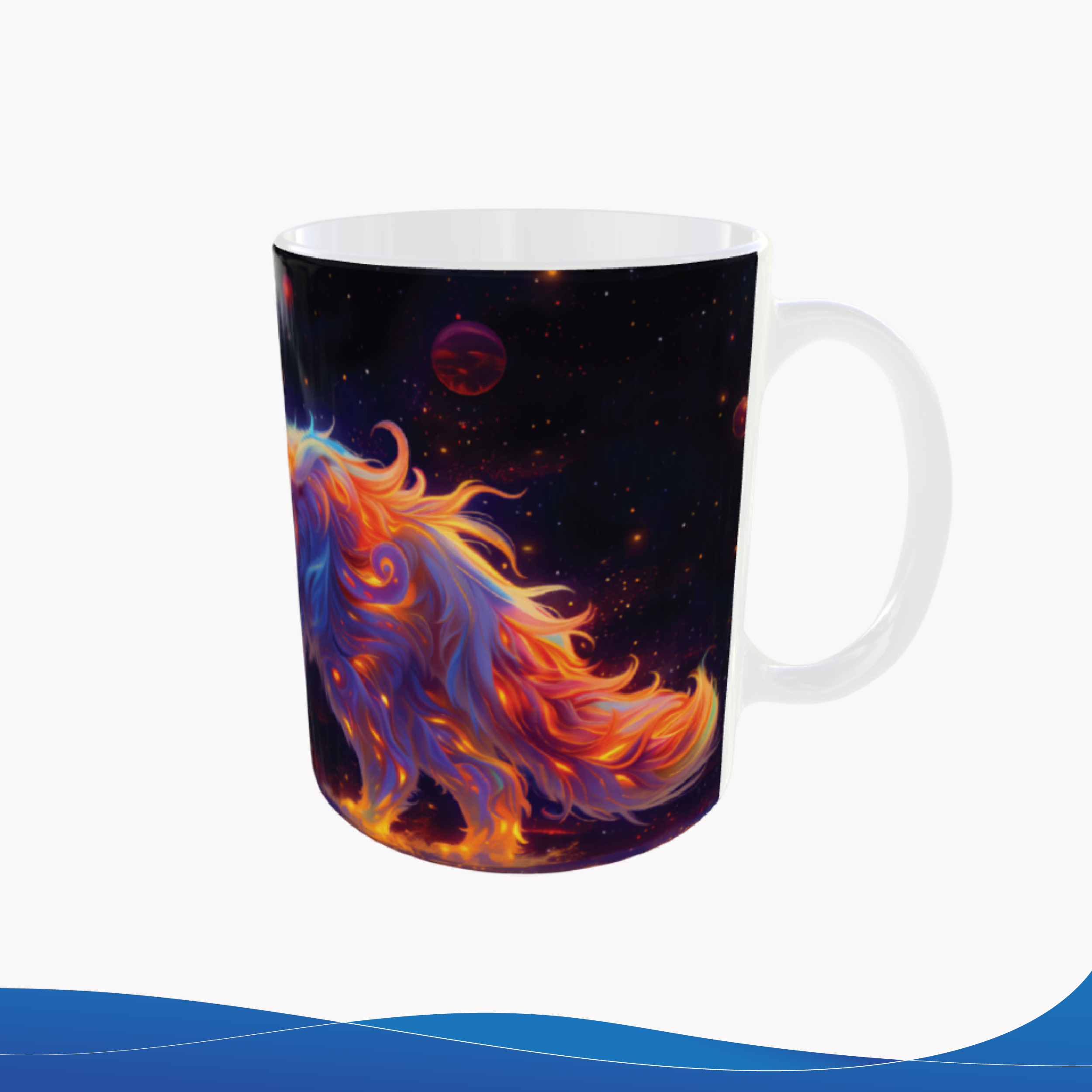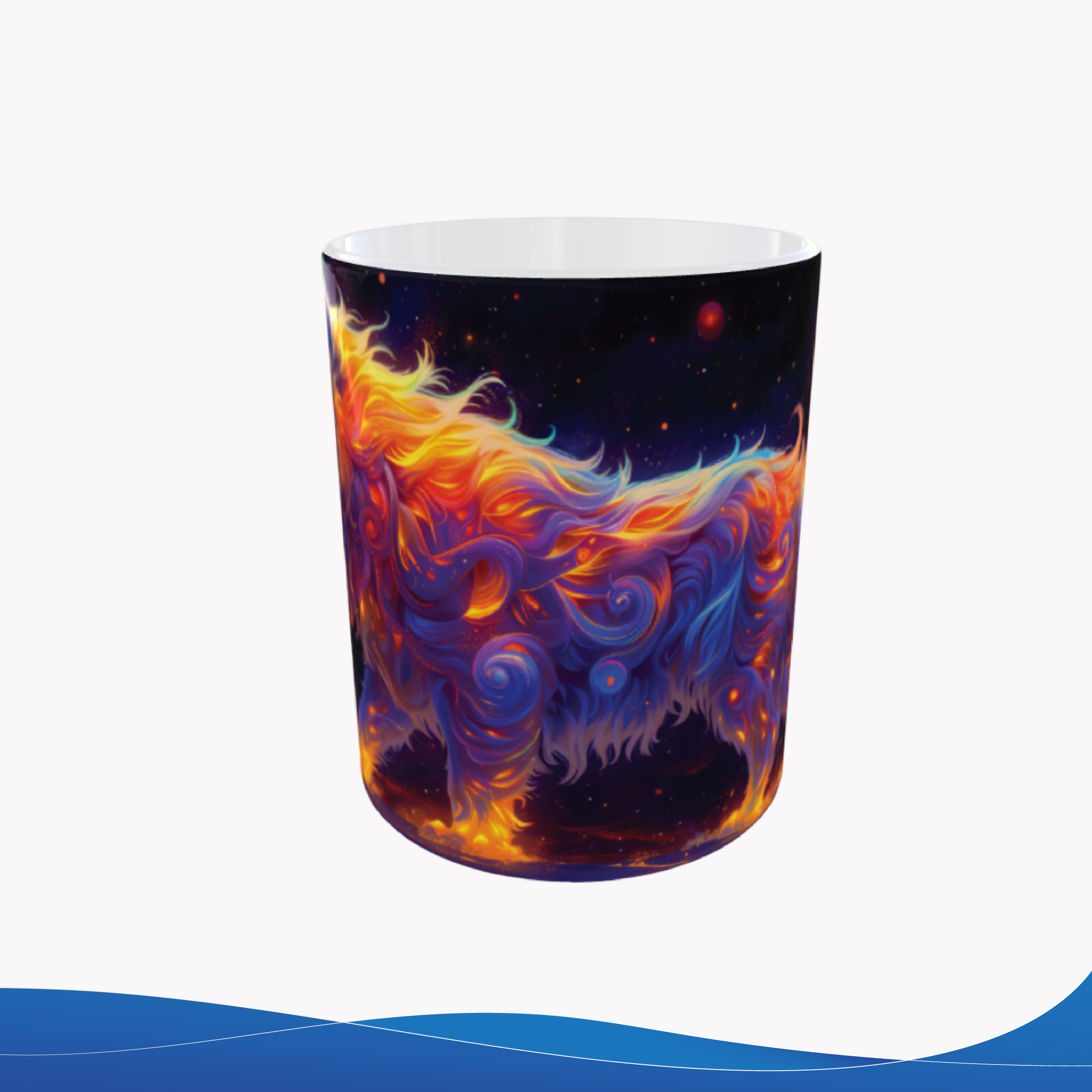 Taza de cerámica 11oz, con ilustración de lobo entre luces coloridas sobre fondo oscuro, un diseño intenso inspirado en el mundo animal y los caninos. Resistente y pensada para el uso diario. ¿Te animas a llevar un diseño con tanta fuerza visual?